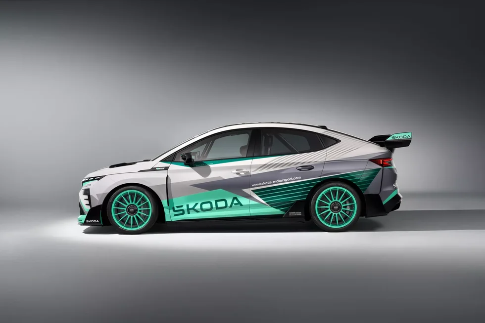 13 Juin 2025 : Le monde du rallye, est-il prêt à basculer vers la technologie 100% électrique ? Opel a déjà lancé sa formule, avec la Corsa-e, et prépare l’arrivée de la Mokka GSE. Un autre constructeur semble s’intéresser à ce nouveau type de voiture de rallye, et il s’agit d’un spécialiste de la discipline. Skoda a une expérience conséquente en rallye, avec l’Octavia WRC dans les années 90, et la Fabia, qui sévit toujours en catégorie WRC2. La marque tchèque nous présente ce concept Enyaq RS Race, qui affiche un look très démonstratif. Ce SUV 100% électrique, a choisi des pièces biocomposites, pour de nombreux éléments de carrosserie, les contre-portes ou le tableau de bord, et les vitres sont en polycarbonate. Résultat, ce gros bébé perd plus de 300kg sur la balance. La double motorisation électrique de 340ch, sera automatiquement, plus efficace. Le 0 à 100km/h est expédié en 4.6s, et la vitesse max de 180km/h est atteint en un rien de temps. La caisse est rabaissée de 70mm, et les suspensions et amortisseurs, sont évidemment, réglables. Les voies et les ailes ont été élargies. Le système de freinage en carbone céramique, s’équipe d’étriers à 10 pistons à l’avant, et 4 pistons à l’arrière. Le véhicule a droit à des jantes spécifiques OZ, de 20 pouces. La marque a voulu travailler sur la sonorisation de cette bête de rallye. Afin de l’entendre dans les spéciales, cette Skoda Enyaq RS Race, s’équipe d’un système extérieur audio, signé Havas. Un haut-parleur à l’avant, et deux à l’arrière, avec une sonorité rageuse selon le constructeur.