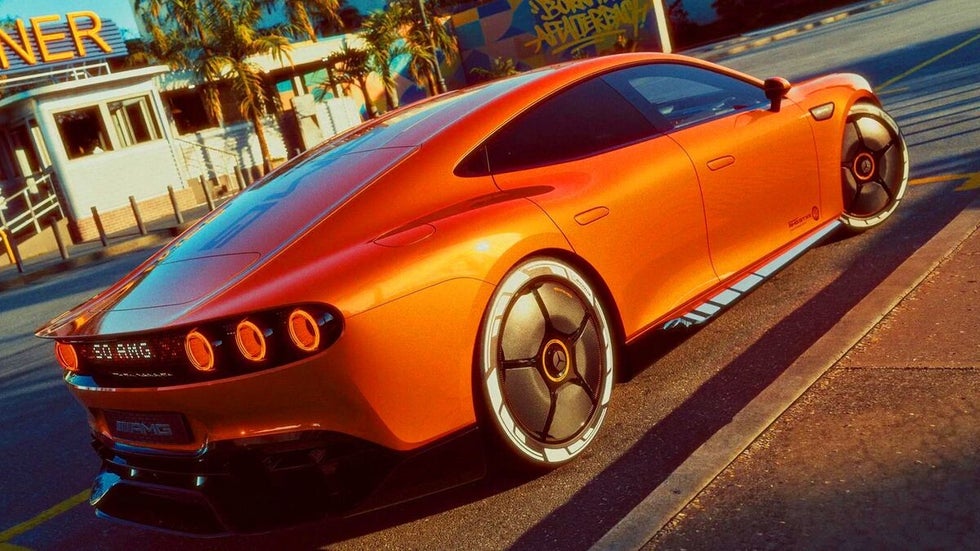 26 Juin 2025 : Mercedes prépare activement son avenir électrique. Même si le constructeur proposera encore des véhicules thermiques ou hybrides rechargeables dans les années qui viennent, de nombreux ingénieurs se concentrent sur les nouvelles technologies 100% électriques, à hautes performances. On vous présente donc ce concept AMG GT XX, qui remplacera à moyen terme, la grosse berline AMG GT 4 portes, actuellement au catalogue. Ce futur modèle, est plutôt radical dans sa conception, avec l’adoption d’une toute nouvelle plate-forme (AMG.EA) qui intègre la batterie, un système aérodynamique actif, un style très racé, et un habitacle ultra-sportif. Cette face avant néo-rétro, se pare d’une calandre grillagée éclairée, d’un bloc phare principal type Maserati sur les ailes avant, et d’un capot avant avec extracteurs d’air. Cette Mercedes AMG GT XX dispose de différents volets actifs, au niveau du bouclier et du diffuseur, et les soubassements sont entièrement carénés. Les jantes aérodynamiques disposent également de volets actifs. Pas de lunette arrière sur cette berline sportive, on note au niveau de la poupe, un éclairage à trois cercles lumineux, et ce bandeau noir avec panneaux lumineux. Dans l’habitacle, on a droit à un univers assez dépouillé, avec volant type Formule 1, une instrumentation 10.2 pouces, accolée à un écran central de 14 pouces, et un éclairage d’ambiance spécifique. Mercedes utilisera un maximum de matériaux recyclés à bord, sans toucher à la qualité perçue. La marque à l’étoile dévoile quelques données techniques. Ce monstre s’équipera d’une triple motorisation électrique de 1360ch, avec des blocs de nouvelle génération à flux axial, plus performants et moins volumineux. Les deux moteurs arrière, propulsent en permanence, alors que l’unité avant, rentrera en action, selon les besoins. On ne connaît pas encore la capacité de la batterie, mais elle sera de type NMCA (nickel, manganèse, cobalt et aluminium), avec anode en silicium. Elle pourrait récupérer 400km d’autonomie, en à peine 5 minutes.