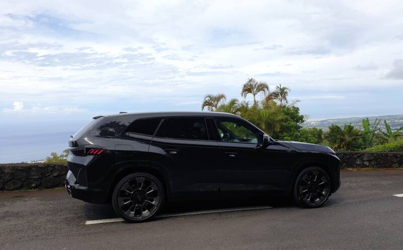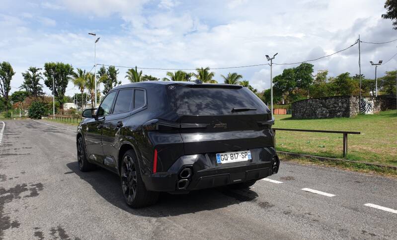 Avec un empattement de 3.11m, rien d’étonnant de trouver un espace habitable conséquent pour les cinq passagers. L’agencement de la planche de bord rappelle les X5 ou X7, mais le niveau de finition est encore plus exceptionnel. Quelques petits plastiques qui dénotent, mais à part ça, c’est du grand art. Cuir étendu, aluminium, alcantara, carbone, ciel de toit 3D illuminé, BMW propose en prime, quelques combinaisons de teinte très audacieuses à bord. On peut se permettre tous les excès avec ce XM. L’équipement de série est plus généreux qu’à l’habitude, mais on sait que les véhicules importés à la Réunion, disposeront d’une sacrée liste d’options en plus. L’instrumentation numérique de 12.3 pouces, l’écran central de 14.9 pouces, système Hifi Bowers&Wilkins, vous pourrez vous amuser à paramétrer votre véhicule aux petits oignons, en vous baladant dans les innombrables menus du système multimédia. Le coffre de 527 litres permet déjà d’embarquer bien des bagages, mais on pouvait espérer mieux pour un engin de cette taille. N’oublions pas qu’il s’agit d’une hybride rechargeable, qui doit loger son énorme batterie de 25.7kWh, mais également la transmission au niveau du train arrière.
