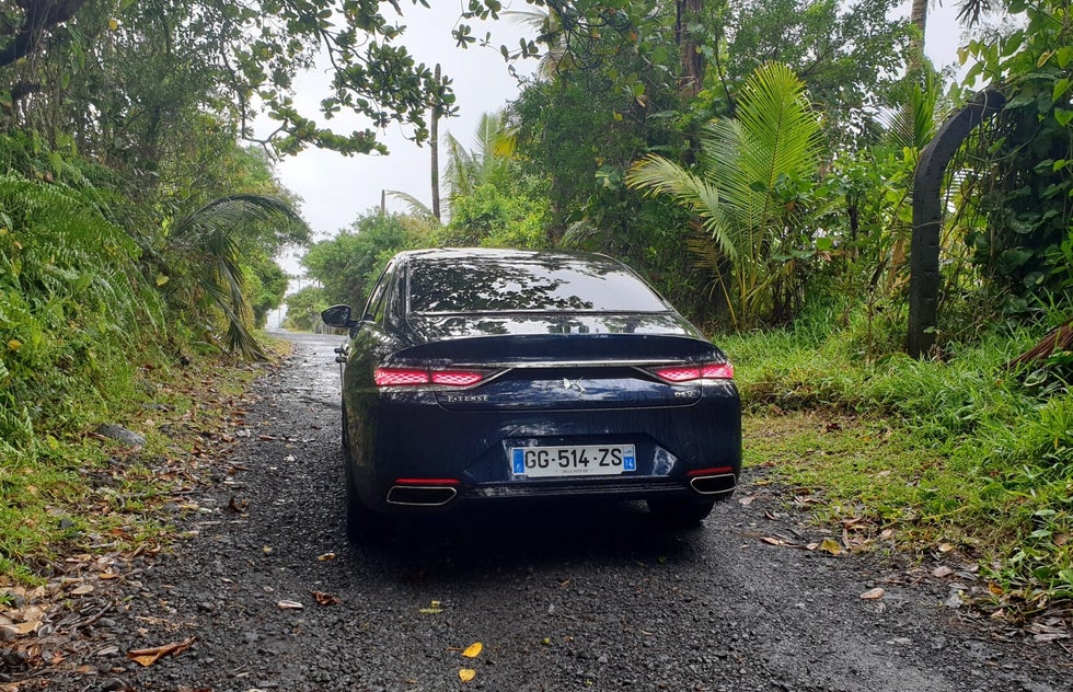 Douceur de fonctionnement, et une cinématique parfaite entre le moteur thermique, le bloc électrique et la boîte EAT8, cette DS 9 vous berce gentiment. En conduite coulée, les passages de rapports sont imperceptibles, et le silence est appréciable, mais il faut prendre en compte le pare-brise et le vitrage feuilletés. La suspension pilotée qui scanne la route 5 mètres en avance, assouplit l’amortissement ou la durcit selon les conditions, tout en réduisant au maximum les vibrations, malgré la monte pneumatique en 19 pouces. Sans atteindre le moelleux de l’antique DS21, il faut bien avouer que le confort reste royal. Malgré son gabarit imposant, on peut augmenter le rythme, et activer le mode Sport, même si ce n’est pas sa tasse de thé. Le niveau d’adhérence, et la réactivité du train avant, sont sans reproche, et le véhicule reste très maniable, avec un rayon de braquage assez court. Une fois la batterie déchargée sur long parcours, cette DS 9 perd un peu de puissance bien évidemment, tout en restant agréable côté agrément de conduite. La récupération d’énergie en descente est malheureusement perfectible, même avec la boîte en mode Brake. Vous pouvez recharger la batterie selon un niveau prédéfini, mais il ne faut pas abuser de cette solution, avec une consommation qui pourrait très rapidement augmenter (à privilégier sur route nationale). A la fin de notre parcours d’environ 220km, nous avons enregistré une consommation moyenne de 7.3L au 100km, en partant avec une batterie chargée. Il faut dire que nous l’avons mis à l’épreuve dans les hauteurs de notre île.