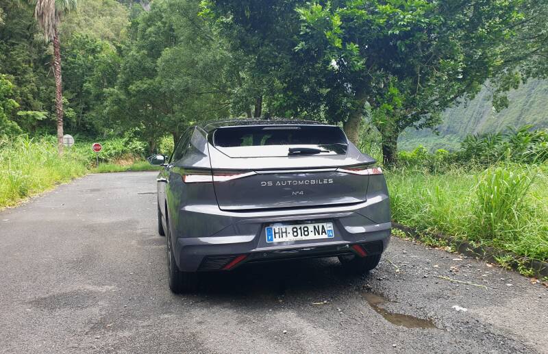 Belle amplitude de réglages et sièges enveloppants, du cuir à profusion autour des passagers, cette DS N°4 vous met à l’aise. Néanmoins, si le système multimédia est suffisamment réactif aujourd’hui, je ne le trouve pas encore très intuitif. Il faudrait appréhender ce système pendant quelques jours, et trouver la meilleure configuration au niveau des widgets. Heureusement, un bouton magique sur la console centrale, nous permet de désactiver les aides à la conduite les plus irritantes. En roulant, on n’a pas été déçu par ce bloc mild-hybrid 48V. La boîte de vitesse est bien assez rapide, et il n’y a pas de rupture de couple lors des passages de rapport, grâce à l’appui du petit moteur électrique. Cela favorise grandement l’agrément de conduite. Avec son poids contenu pour un véhicule moderne, la DS N°4 se montre bien assez dynamique, avec ses 145ch et 230nm de couple. Le moteur est linéaire, mais ça n’arrête jamais de pousser. On peut évidemment activer le mode Sport, et peut même passer en mode manuel, grâce aux petites palettes au volant. Ce n’est pas sa tasse de thé, et le véhicule passe le rapport supérieur, si vous le poussez un peu trop dans les tours. Néanmoins, on peut adopter un excellent rythme. Côté châssis, la DS N°4 est un poil moins dynamique que sa cousine, Peugeot 308. Son amortissement, un poil plus souple, ne la rend pas pataude pour autant. On a toujours un très bon feeling au niveau de la direction et le train avant est plutôt incisif. Le confort est lui, très appréciable, et les pneus à flanc large, offrent une bonne filtration. On peut donc aller très loin, avec un véhicule très sécuritaire sur nationale. Le Drive Assist se montre précis, avec une berline qui suit la route sans sourciller, tout en se montrant très douce dans ses réactions, face à la circulation. DS semble avoir parfaitement paramétré les aides à la conduite. Côté consommation, même si on dispose d’un des meilleurs système mild-hybrid, avec un moteur thermique qui se met en veille aussi souvent que possible (en ville, en manœuvre, en descente, ou à vitesse stabilisée jusqu’à 70km/h), nous n’avons pas réussi à passer sous les 8.5 litres au 100km. Il faut dire que nous n’avons pas été tendres, en empruntant comme à notre habitude, une des nombreuses routes des hauts de l’île.