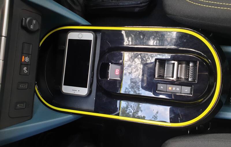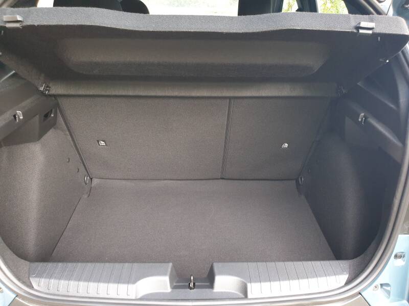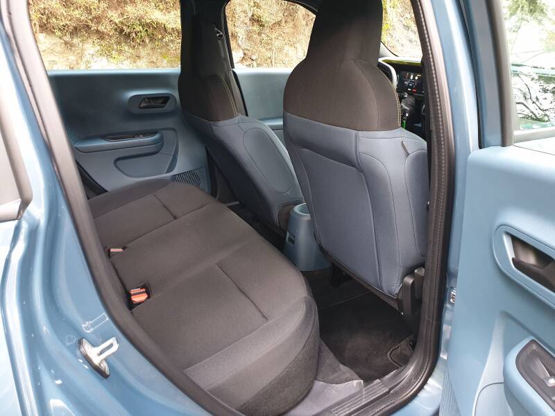 On est également charmé par l’habitacle de cette Grande Panda. A ce niveau de gamme, la plupart des matériaux sont durs. Et pourtant, la présentation intérieure est très sympathique. On a la possibilité de mettre de la couleur, en fonction de la finition choisie. Le tableau de bord intègre une instrumentation numérique de 10 pouces, et un écran central tactile de 10.25 pouces. La forme « oblong » de la planche de bord ou du tunnel central, fait référence à la piste d’essai du Lingotto, à Turin. Volant deux branches avec des commandes physiques intuitives, deux raccourcis sur le tunnel central pour désactiver l’alerte de vitesse et le maintien dans la voie, un panel de rangements à disposition, l’habitabilité est malheureusement un peu juste aux places arrière, surtout si je règle le siège conducteur à ma convenance. Ce châssis Smart Car, dérivé de la plate-forme CMP du groupe Stellantis, n’est pas une référence en termes d’habitabilité. Le coffre cube un bon 360 litres, soit une excellente performance pour un véhicule aussi compact.