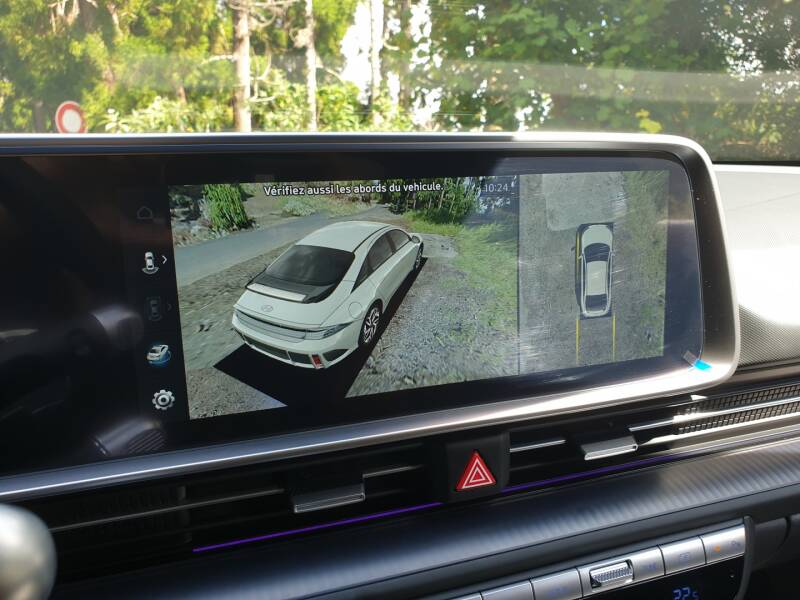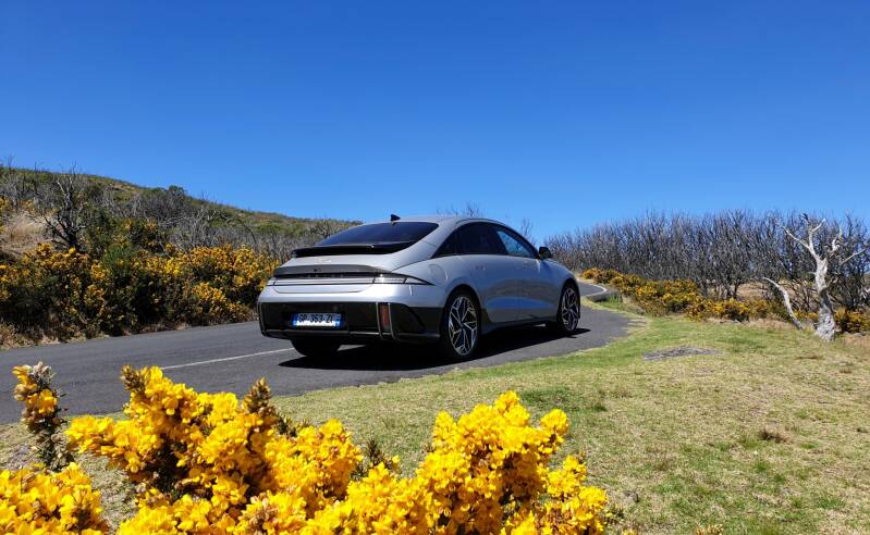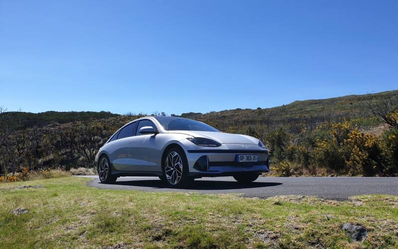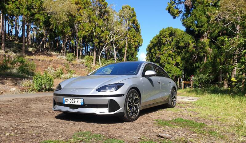 Dommage que les sièges ne soient pas plus moelleux et enveloppants, parque c’est à peu près tout ce que j'ai à lui reprocher. Par rapport au Ioniq 5, nous avons une garde au sol abaissée de 1cm, une garde au toit plus basse de 12cm, et un amortissement raffermi. C’est une évidence, cette berline coupé tient très bien le parquet malgré ses 2.1 tonnes sur la balance. La relative fermeté des suspensions colle parfaitement à son caractère, et tout est bien filtré, préservant ainsi, le confort. Les pneus très larges, permettent en prime, d’être véritablement optimiste, et une fois n’est pas coutume, j’ai bien eu du mal à mettre ce Ioniq 6 en difficulté sur route ouverte. La motricité est également bluffante, avec 4 roues motrices qui arrachent le bitume à l’accélération. Les 325ch et le couple de 605nm, vous donnent une grosse claque dans le dos en sortie de virage, mais vous pouvez toujours amplifier le phénomène en mode Sport. Le mode Eco m’a ravi en descente, avec on ne l’oublie pas, une récupération d’énergie paramétrable sur 5 niveaux. La consommation baisse très rapidement et je récupère une grosse partie de mon autonomie en descendant le Maïdo. Finalement, on termine cette journée avec une consommation d’énergie de 19.1kWh, correspondant à une autonomie de 403km. Bref, à la Réunion, en adoptant une conduite plus apaisée, vous pourrez faire presque deux tours de l’île. En retournant à la concession, j’ai activé l’autopilot, qui s’est montré d’une précision redoutable, se déconnectant uniquement en cas de travaux, si les lignes blanches ne sont pas visibles. Encore un bon point.