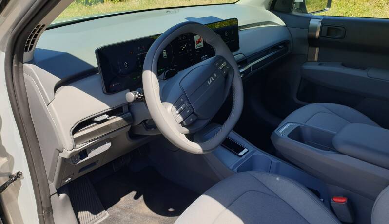 Disposer d’une plate-forme dédiée exclusivement aux véhicules électriques, a de sacrés avantages. Les soubassements accueillent confortablement la batterie, et le moteur électrique est mieux intégré à la structure. Avec son empattement de 2.68m et sa largeur respectable de 1.85m, ce Kia EV3 propose un espace vital conséquent à bord. Pour un véhicule de seulement 4.30m de long, l’habitabilité arrière ne souffre pas la critique, aussi bien au niveau des jambes, que des coudes. A l’avant, c’est encore mieux, avec une position de conduite moelleuse, un grand accoudoir central, de nombreux rangements en partie basse, et un dessin très rectiligne de la planche de bord. Cela procure un sentiment de bien-être. Le combiné d’instrumentation de 12.3 pouces, le petit écran de 5.3 pouces au milieu pour la climatisation, et l’écran central tactile de 12.3 pouces, on est gâté par la multitude d’applications et de fonctions disponibles. Le système est intuitif, mais on peut tout de même se perdre avec une pagaille de sous-menus. Différents types de matériaux à bord, dont une partie qui proviennent des filières de recyclage. Ca sonne creux à pas mal d’endroits, et on peut craindre quelques rayures à moyen terme. L’assemblage du mobilier semble correct. Du textile orne également une partie cette planche de bord, sur la version GT Line. Et côté coffre, avec 460 litres de contenance, l’EV3 fait partie des meilleurs de la classe. A cela, il faut ajouter les 25 litres sous le capot avant, permettant de ranger les câbles de recharge.
