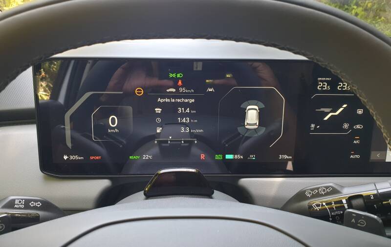 Quand on s’installe à bord, surtout aux places avant, on se sent immédiatement à l’aise. Les surfaces vitrées sont suffisamment importantes, le tableau de bord rectiligne, dégage la vue, l’absence de tunnel central laisse de la place pour mes genoux, et le garnissage gris clair de l’habitacle et de la sellerie, procure une belle luminosité. La petite lunette arrière et les montants épais du montant C, sont beaucoup plus problématiques pour la rétrovision. On remercie donc la caméra de recul, installée de série, indispensable pour effectuer un créneau. Kia a tout misé sur le confort, avec cet EV3. La douceur de la direction, un peu élastique dans son fonctionnement, mais bien assez précise, le moelleux très appréciable de l’amortissement, l’insonorisation très soignée, qui élimine les bruits aérodynamiques et de roulement, la quiétude règne à bord. Ce crossover urbain pèse son poids, mais ces plus d’1.7 tonne, ne semble pas poser de soucis côté performances et tenue de route. Avec ses 14cm de garde au sol, elle est aussi basse qu’une berline, alors on va oublier le tout-chemin pour cette fois. La grosse batterie, bien calé dans le plancher abaisse logiquement un peu plus, le centre de gravité. Résultat, il n’a pas été nécessaire de durcir les suspensions. L’EV3 filtre les inégalités de la route, les mouvements de caisse sont contrôlés, et on ne ressent aucune vibration. Le moteur est très progressif en mode Normal, et en mode Sport, le véhicule fait preuve d’une belle réactivité, avec un couple disponible, plus rapidement. Rien à lui reprocher sur ce point, avec des accélérations dynamiques. Et on va terminer, en faisant un bilan consommation. On rappelle, qu’on peut régler la régénération de la batterie sur 4 niveaux (0,1,2,3) grâce aux petites palettes derrière le volant, et une fonction One-Pedal est activée en permanence. On peut jouer avec les 5 modes de conduite (Eco, Normal, Sport, MyDrive et Snow), dont un, paramétrable. Résultat, on finit la journée, avec une consommation 17.8kWh au 100km, correspondant à une autonomie réelle de 320km.