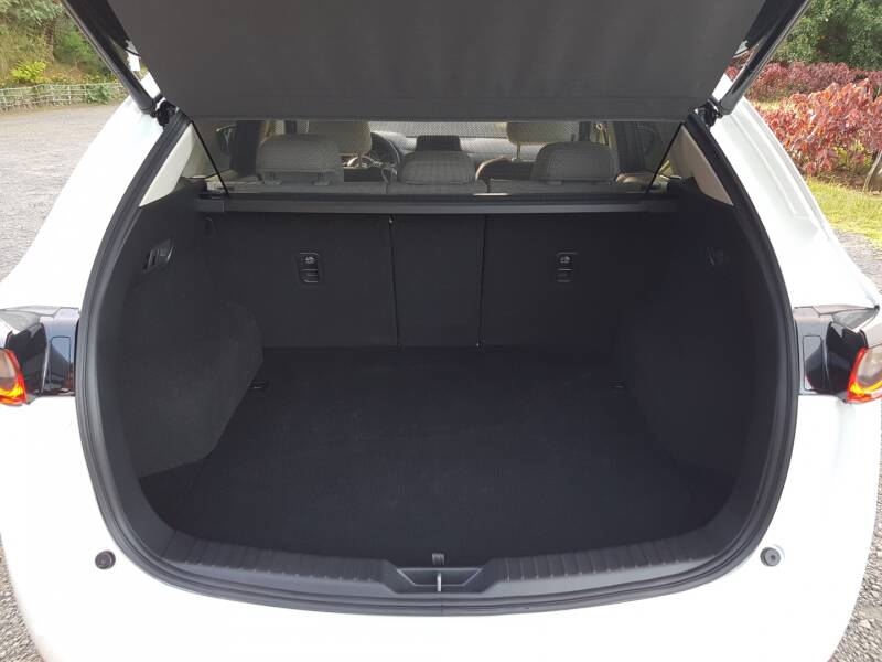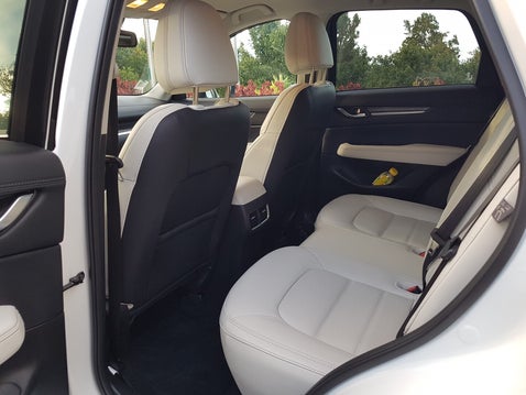 Le nouvel aménagement intérieur suit la même tendance. Les trois compteurs ronds sont toujours de la partie, mais on apprécie avant tout le dessin de la planche de bord, et son côté rectiligne. Plus ordonné, l’ensemble paraît clair, avec une ligne pour les aérateurs, un emplacement pour les commandes de climatisation, un tunnel central imposant avec molette intégrée, et un écran couleur tactile de 7 pouces au sommet. Plus moderne, ce Mazda CX-5 monte aussi en gamme au niveau de la finition, avec des plastiques de qualité, et de nombreuses parties moussées au niveau des genoux et sur les contre-portes. L'option sellerie blanche perforé de notre modèle éclaircit l'habitacle. Le coffre cube quant à lui, entre 506 litres et 1365 litres.