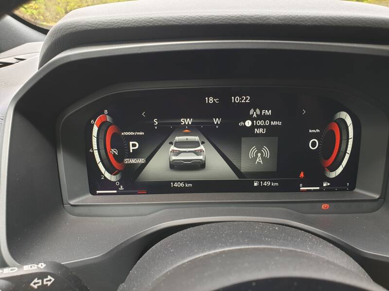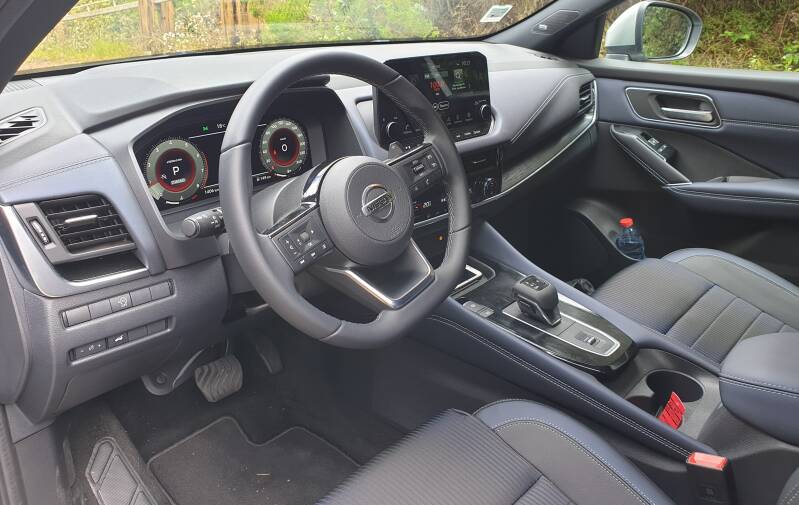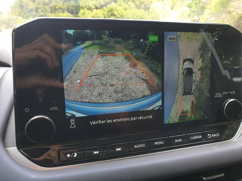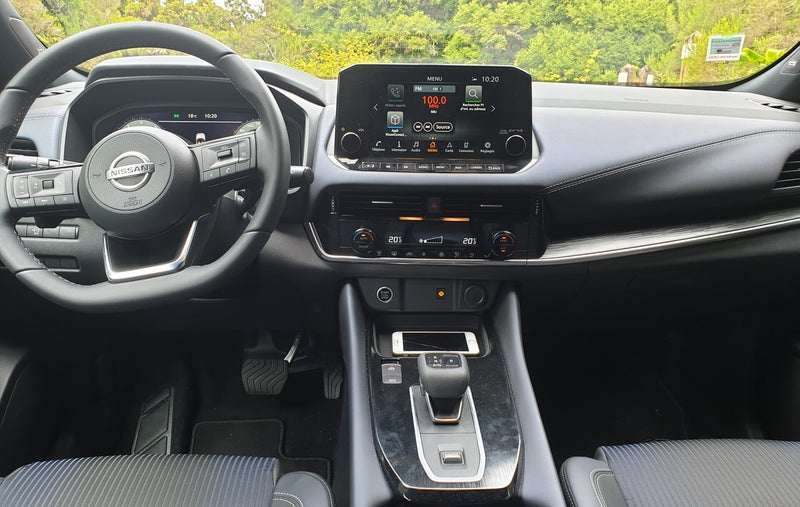 Notre modèle d’essai disposait donc du bloc 1.3DiG-T (Turbo essence) MHEV, qui développe 158ch à 5500tr/mn et 270nm de couple à 1800tr/mn. Il est associé à un système micro-hybride 48V avec batterie lithium-ion offrant 6nm de couple supplémentaire. Avec la nouvelle plate-forme CMF-CD, le véhicule mesure 4.43m de long, 1.84m de large, son empattement est de 2.67m, et sa garde au toit de 1.63m. Il pèse 1542kg et chausse du 235/55R18. Le 0 à 100km/h est effectué en 9.2s, et il croise à 199km/h. Nissan annonce une consommation mixte de 6.4L au 100km pour des rejets de CO2 de 144g/km (malus de 280€).