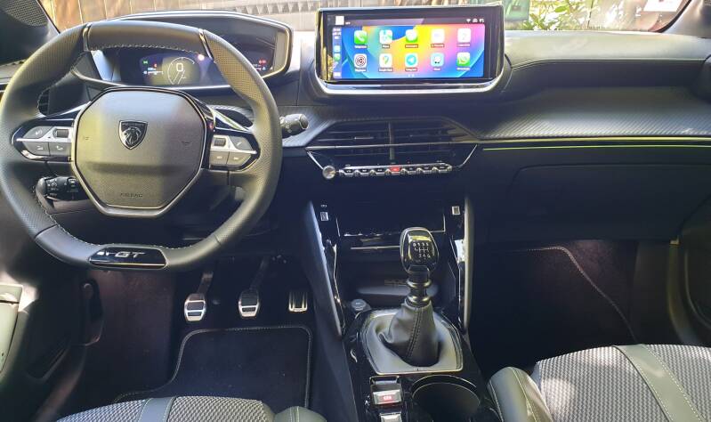 Dans l'habitacle, la 208 profite bien sûr, des toutes dernières technologies, et ça commence par le nouvel écran central de 10 pouces, avec le système Peugeot i-Connect ou i-Connect Advanced. Le petit levier de vitesse disparaît, au profit d’une gâchette. Sur les finitions Allure ou GT, le client disposera respectivement, d’une instrumentation 2D ou 3D. La caméra de recul en finition Allure, ou la caméra supplémentaire avant en finition GT, sont de qualité HD, à présent. L'habitabilité aux places arrière, est toujours un peux juste, mais le coffre cube un satisfaisant 352 litres. Côté finition, la 208 est une très bonne élève, avec des matériaux de bonne facture, et un assemblage rigoureux. L’ambiance est définitivement sportive en finition GT, avec la sellerie bi-matière et les surpiqûres jaune fluo, mais l’habitacle reste très sombre.