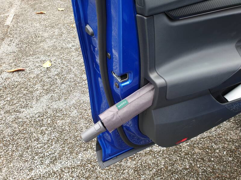 On va directement commencer par l’habitabilité. Grâce à cet empattement toujours aussi généreux, les passagers arrière seront aux anges, avec un espace conséquent. A l’avant, je suis charmé par le dessin de cette planche de bord, à la fois classique, élégante, et ergonomique. Le conducteur fait face à une mignonne petite instrumentation de 5.3 pouces, qui peut être secondée par un affichage tête-haute de dernière génération. L’écran central tactile de 13 pouces, est rapproché, grâce à une console centrale décalée par rapport à la planche de bord. Le véhicule garde quelques commandes physiques, des commandes tactiles, et on peut installer des raccourcis à l’écran pour certaines fonctions. Le système MIB4 du groupe VAG est performant, l’écran est très réactif, mais on a des menus qui vont dans tous les sens. Niveau finition, la majorité des plastiques sont moussé, du similicuir habille la planche de bord, Skoda ajoute du plastique type carbone et alu, et les bacs de porte accueillent de la moquette. Pas de doute, on est tout de même, dans un véhicule qualitatif. Le coffre de 470 litres est modulable, et on dispose d’un filet très pratique, accroché à la plage arrière. Comme d’habitude chez Skoda, un parapluie intègre la contre-porte avant.