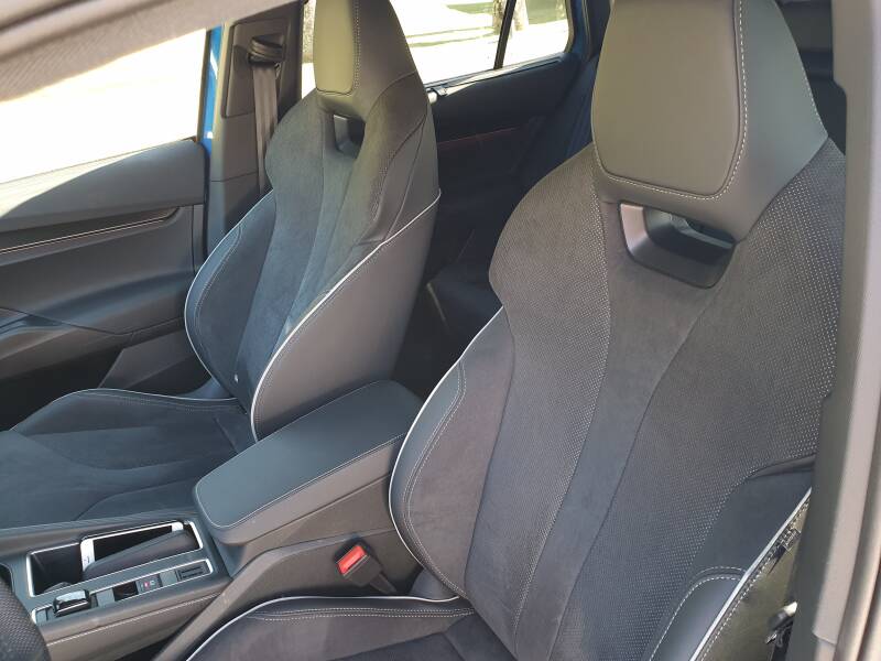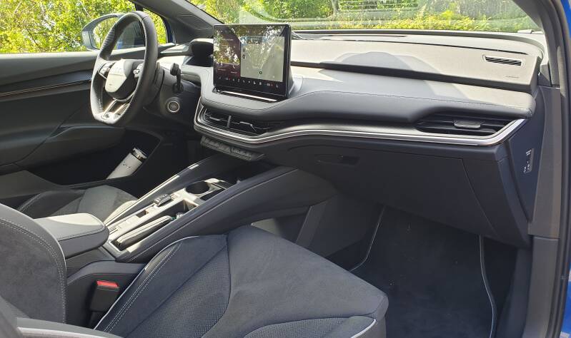 Notre modèle d’essai était donc équipé du bloc électrique de 204ch et 310nm de couple, positionné sur le train arrière. Le véhicule mesure 4.49m de long, 1.88m de large, sa hauteur est de 1.65m, et son empattement, de 2.77m. La garde au sol est de 19cm. Le véhicule pèse 1979kg à vide et chausse du 235/45R21. Le 0 à 100km/h est effectué en 8.0s, et la vitesse maximum est de 160km/h. Avec sa batterie de 58kWh net, Skoda annonce une autonomie de 427km.