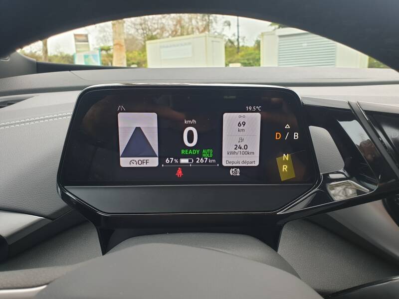 On commence par faire connaissance avec le système multimédia, finalement assez pratique, mais dont le graphisme est un peu fade. Remise à zéro de la consommation d’énergie, on peut enfin prendre la route. Effectivement, le tout tactile peut poser quelques problèmes, surtout avec les commandes au volant, bien trop sensibles, et le retour haptique n’est pas des plus agréables. Côté gauche de la planche de bord, les commandes d’éclairage sont tout aussi capricieuses, en étant cette fois-ci, peu réactives. Finalement, c’est quand on roule que l’on apprécie le plus cet ID4. La petite instrumentation InfoDisplay de 5.2 pouces, fournit suffisamment d’informations et l’affichage tête-haute est agréable. Disposer d’une propulsion a aussi quelques avantages en terme de maniabilité, avec un véhicule qui tourne dans un mouchoir de poche. Etonnant, vu le gabarit respectable de l’engin. Le moteur électrique est très souple, et met rarement à mal le train arrière, sauf sur surface humide, où il va couper la puissance à bon escient. De toute façon, on peut compter sur la gigantesque monte pneumatique en 21 pouces. Le feeling au niveau de la direction n’est pas exceptionnel, mais on sait très bien que le niveau d’adhérence est élevé. Les pneus taille basse ne perturbent pas outre-mesure le confort, avec un amortissement relativement souple. Côté consommation, j’ai commencé à avoir des doutes en arrivant au sommet de notre périple, avec un ordinateur de bord qui affichait 30kWh au 100km. J’ai vite été rassuré en redescendant, et en me positionnant en mode Eco, et en activant la fonction B de la boîte. La récupération d’énergie est suffisamment efficace, et on termine cette journée d’essai, avec un excellent 16.7kWh au 100km, correspondant à une autonomie très confortable de 443km. Etrange sensation au niveau de la pédale de frein, avec une course assez longue au départ, correspondant à la récupération d’énergie au freinage, avant que les plaquettes ne rentrent en action. Une habitude à prendre.