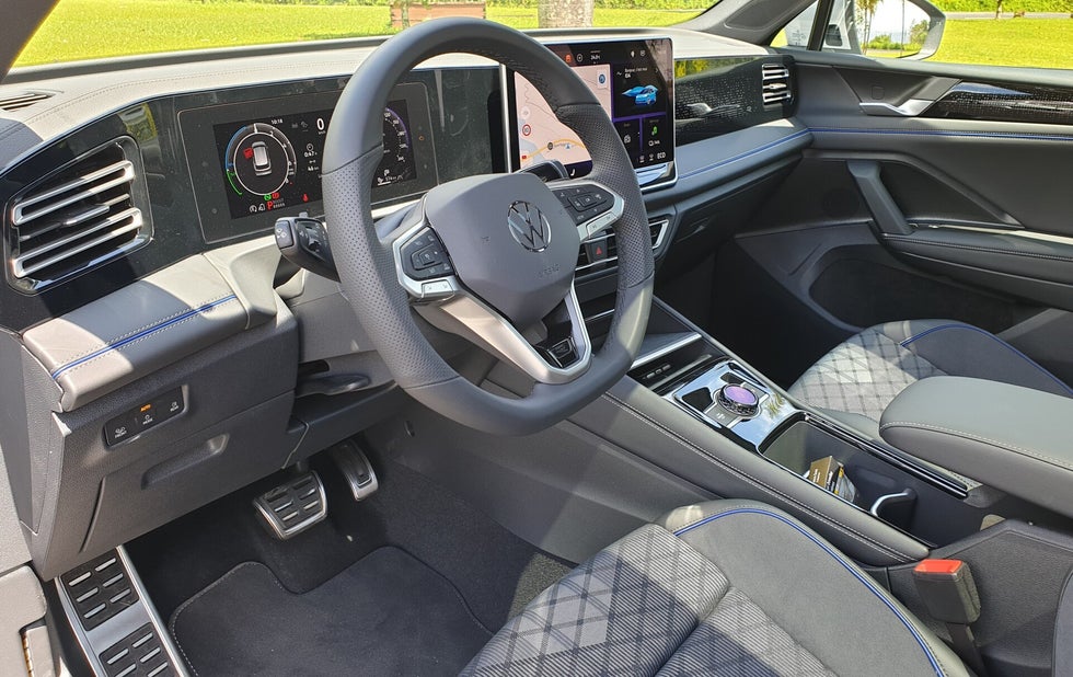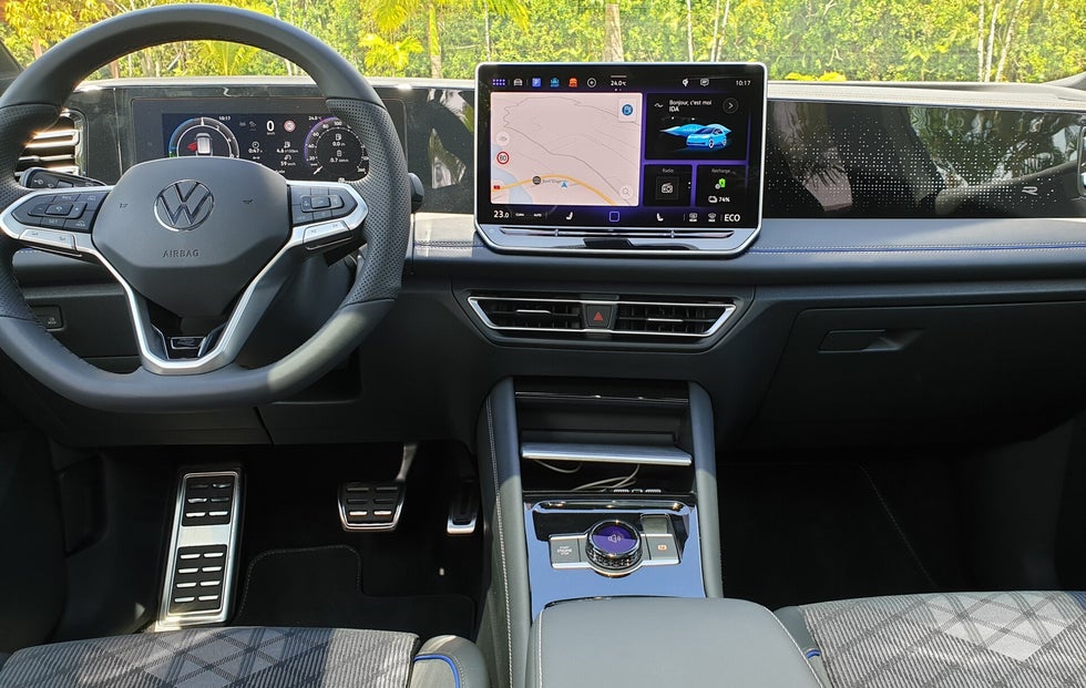 La planche de bord est également très classique, mais l’agencement rappel forcément les dernières réalisations de la marque, et elle est bien plus moderne. L’instrumentation numérique de 10 pouces est lisible et paramétrable, le client disposera d’un grand écran central de 12.9 pouces, et même de 15 pouces, en finition haut de gamme. Ce Tiguan est équipé du système d’info-divertissement MIB4, performant et ultra-réactif selon Volkswagen. Le grand bandeau noir qui habille la planche de bord, peut intégrer l’éclairage d’ambiance. Bonne nouvelle, ce Tiguan s’équipe de commandes physiques au volant, bien plus agréables que les touches tactiles, encore présents sur certains modèles de la marque. Impossible pour ma part de critiquer le niveau de finition de ce Tiguan en finition R-Line, avec des matériaux qualitatifs et un assemblage toujours aussi rigoureux. Côté habitabilité, ce SUV du segment C, fait toujours référence, avec un espace pour les jambes, indiscutable. Le coffre cube un excellent 652 litres, avec les motorisations thermiques ou micro-hybrides, mais avec notre modèle d’essai hybride rechargeable, on devra se contenter de 490 litres. Ca reste une valeur acceptable pour la catégorie.