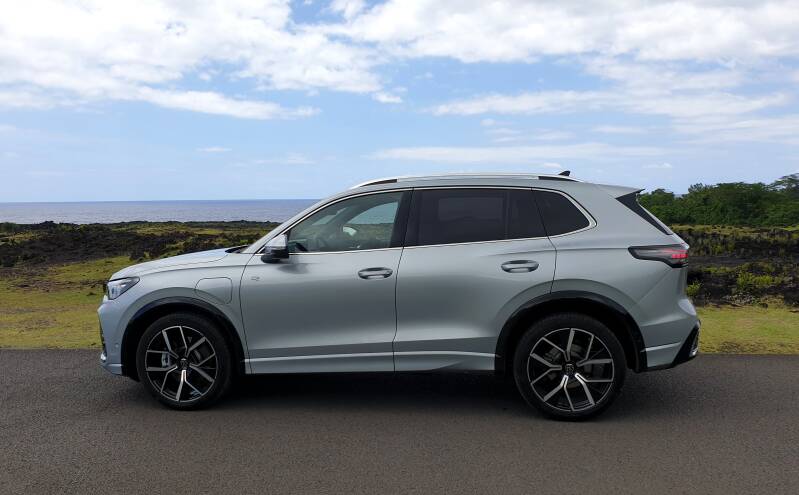 Cette version hybride rechargeable, était donc équipé d’un bloc essence 4 cylindres 1.5L Turbo de 150ch et 250nm de couple, associé à un moteur électrique de 115ch. La puissance cumulée est de 204ch, pour un couple de 350nm. L’ensemble est accouplé à une boîte DSG 6 à double embrayage. Le véhicule dispose d’une toute nouvelle batterie NMC (Nickel Manganèse Cobalt) de 25.7kWh brut, soit 19.7kWh Net. Elle permet de déplacer ce Tiguan, sur près de 120km en mode électrique (vitesse maxi de 130km/h). En conduite hybride normal, le 0 à 100km/h est avalé en 8.2s, et la vitesse maxi est de 210km/h. Le véhicule mesure 4.54m de long, 1.84m de large, sa garde au toit est de 1.66m, et son empattement, de 2.68m. Il pèse 1867kg à vide et chausse du 255/40R20. De série, on dispose de la suspension piloté DCC Pro à double valve. Selon les normes WLTP, Volkswagen annonce une consommation ridicule de 0.5L au 100km, pour des rejets de CO2 de 11g/km.