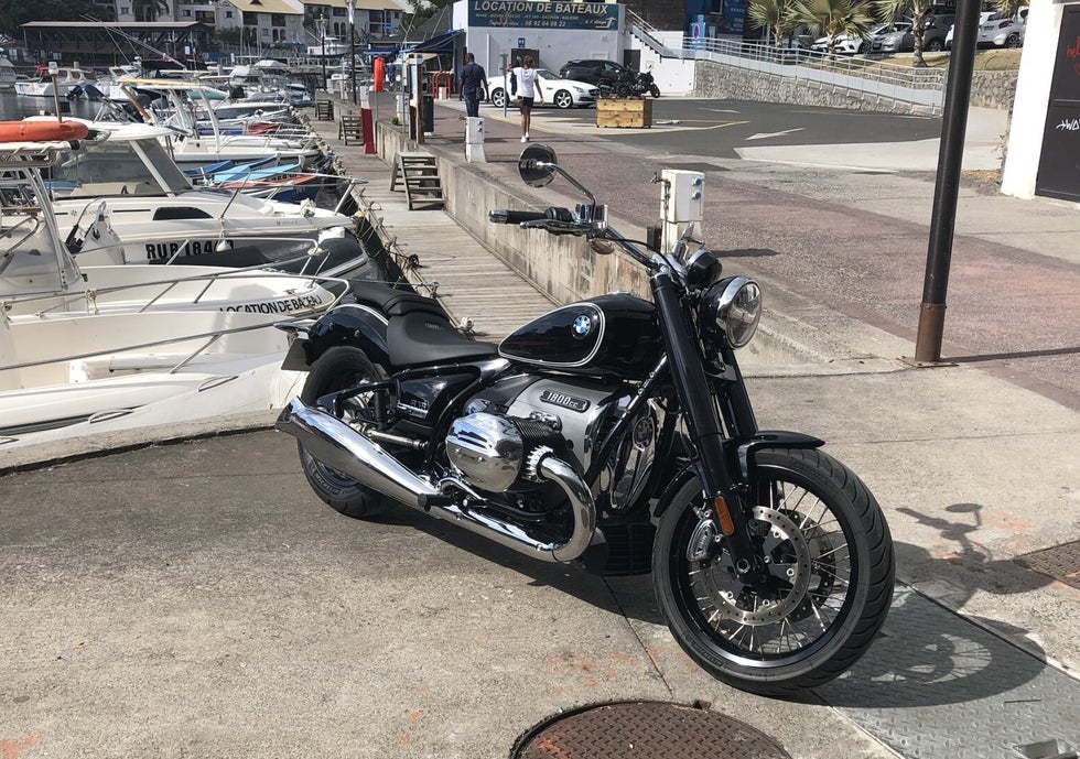 A cause de ces énormes pistons, on a un petit mouvement latéral gauche à chaque démarrage, mais également à l’arrêt, quand on accélère. BMW a réussi par contre, à filtrer les vibrations de ce Flat-Twin. La douceur et l’onctuosité de ce moteur, sont à un niveau assez exceptionnel, et la commande d’embrayage très douce, ajoute au confort. Bien sûr, on peut le faire monter dans les tours, avec une poussée très franche malgré sa grande linéarité, mais la R18 s’apprécie en conduite coulée, où son couple fera des merveilles. Ce gros bloc reprend à 1500tr/mn, à n’importe quelle vitesse, et peu importe le rapport. Vous pourrez choisir entre les modes Rain, Roll ou Rock, mais je suis resté personnellement calé sur le plus dynamique, bien assez souple pour moi. Attention dans les embouteillages à bien prendre en compte, la largeur de ces cylindres, car on aura vite fait de cogner un pare-choc de voiture. Justement, les balades en ville ne sont pas de tout repos. Le centre de gravité est bas, mais ce custom ne s’apparente pas à un vélo, et le rayon de braquage est problématique en cas de manoeuvre. La marche arrière grâce à un petit moteur électrique, peut rendre quelques services, tout comme l’aide au démarrage en côte, des options de notre modèle d’essai. On peut s’aventurer dans les hauteurs de l’île, mais je vous conseille d’éviter les chemins trop sinueux, où vous le regretterez dans certaines épingles. Le poids de la machine se fait alors ressentir. Non, cette R18 est faite pour cruiser sur le littoral. Sa stabilité dans les courbes met rapidement en confiance, mais attention de ne pas exagérer la mise sur l’angle sous peine de frotter le bitume. La selle est un peu dure, et les 90mm de débattement de l’amortissement arrière sont un peu justes, mais je n’aurai aucun mal à faire un tour de l’île sur cette magnifique machine. Pour parfaire le voyage, j’ajouterai, la grande bulle de la version classique, afin d’être totalement protégé du vent.