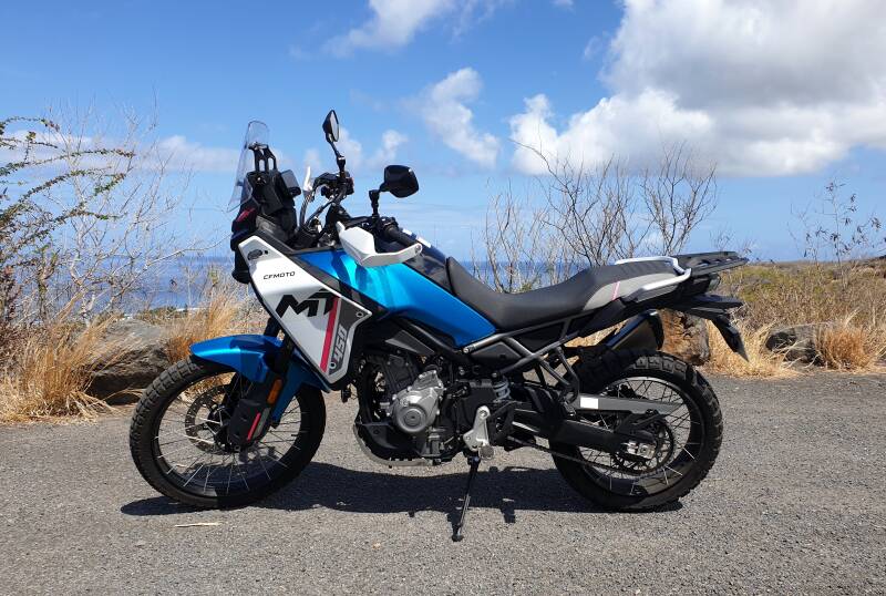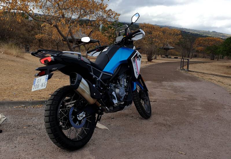 Un simple coup d’oeil, et on sait déjà à quel type de moto on a affaire. Les grandes jantes avec du 21 pouces à l’avant et du 18 pouces à l’arrière, le garde-boue en hauteur ou bas (au choix), la monte pneumatique tout-chemin, la hauteur de selle variant de 800mm à 820mm d’origine, et de 870mm en option, et la garde au sol de 220mm, annoncent la couleur. Bref, c’est la définition d’un véritable trail pour moi, mais on va également s’attarder sur le design de cette chinoise. Bien sûr, le look, c’est totalement suggestif, mais il faut bien avouer que le style de cette machine, rappelle forcément le monde du rallye-raid. CFMOTO l’a équipé d’un double optique avant sur deux étages, avec une signature lumineuse traversante. Ces feux intègrent un joli carénage, surplombé par une bulle réglable. De profil, on remarque immédiatement le nouveau cadre tubulaire en acier, avec un double berceau à l’avant et un treillis au niveau de la boucle arrière. En partie basse, le sabot moteur semble évidemment indispensable sur ce type d’engin. Le pot d’échappement, placé assez haut, ne devrait pas poser de soucis, même lors d’un usage intensif en tout-terrain.