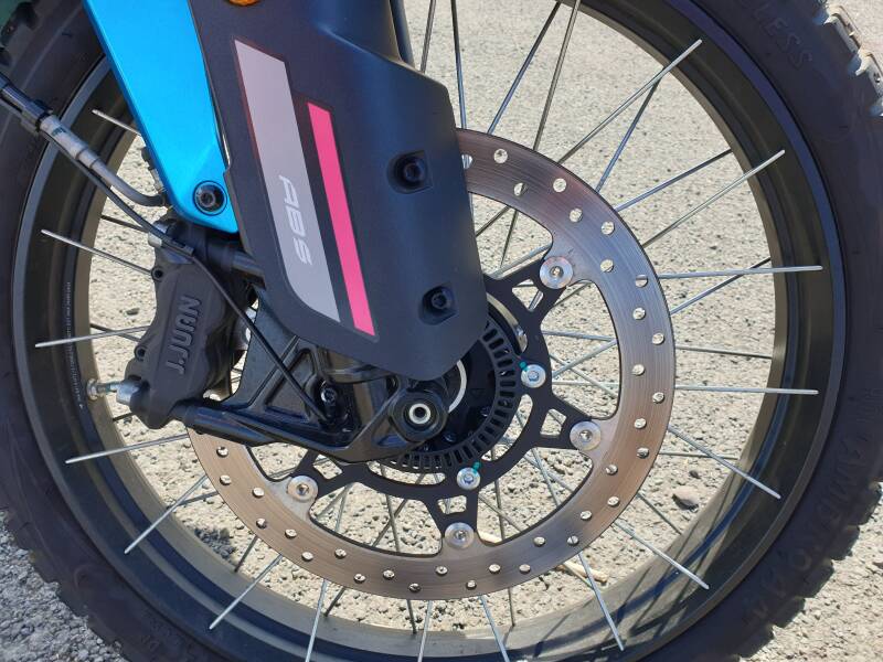 Bien sûr, avec un poids de 175kg à sec, et d’environ 190kg en ordre de marche, je m’attendais à une moto plutôt agile. Dès les premiers tours de roue, j’ai carrément été surpris par la réactivité de ce châssis. La grande jante de 21 pouces y est certainement pour quelque chose, mais ce qui me surprend le plus, c’est cette impression de légèreté au niveau du bac à essence. C’est à se demander, si le précieux liquide n’est pas positionné plus bas, malgré les apparences. Le grand guidon facilite un peu plus le travail. Bref, la 450MT est un véritable vélo. Le confort est appréciable, mais il faut savoir que l’on peut régler son amortissement à l’envie. Les réglages standards préservent mes vieilles vertèbres, et ça me va parfaitement. En fait, je n’aurai aucun mal à me sentir totalement à l’aise avec cette machine, après avoir effectué quelques réglages au niveau de l’assiette et du guidon. En attendant, j’arrive à facilement caser mes 1.86m, la selle est suffisamment douce, et la balade en duo, est tout aussi agréable. Il faut s’habituer à cette monte pneumatique tout-terrain. C’est la première fois que je teste ces « CST Ambro A4 », mais je ne me fais pas trop de soucis, même sur surface lisse. Vous n’adopterez pas un rythme de supermotard, mais l’agilité de cette CFMOTO sur route sinueuse, est un vrai plaisir. Dommage, je n’ai pas pu la tester en tout-chemin, comme je l’aurai voulu, mais je n’ai aucun doute sur les capacités de l’engin. Maniable, réactive et doté d’un moteur très souple, la piloter sur chemin de terre ou rocailleux, semble assez simple. On n’oublie pas que l’on peut déconnecter l’ABS arrière et le contrôle de traction, soit à l’écran ou directement au guidon. J’aurai évidemment apprécié quelques chevaux de plus à haut-régimes, même si ce bloc prend ses tours avec entrain. Dommage, la boîte est assez rétive à descendre les rapports, et j’avais déjà remarqué ce souci sur le roadster 450NK. Espérons que ce soit une histoire de rodage.