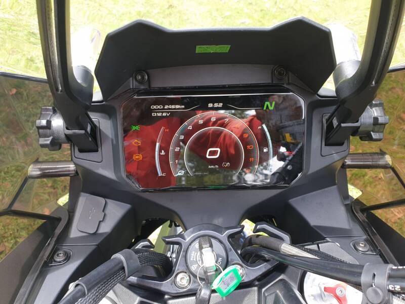 En s’installant à son guidon, on note la présence de cet écran TFT de 5 pouces, qui diffère de l’écran LCD noir et blanc de la 650MT. On peut se balader facilement dans les menus, connecter son smartphone bien sûr, et on dispose de prises USB-A et USB-C. Pas d’électronique embarqué, il faut dire que cette 700MT dispose d’un accélérateur par câble. Oubliez donc le traction control, le controle du frein moteur ou les différents modes de conduite. En faisant l’impasse sur ces technologies, CFMOTO mise évidemment sur un tarif contenu pour attirer le chaland. Bien installé, j’apprécie déjà les déflecteurs, la grande bulle réglable manuellement, et la protection pour les jambes semble satisfaisante.