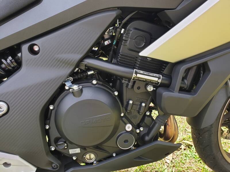 Cette CFMOTO 700MT est donc équipée d’un bicylindre paralèlle de 693cm3, calé à 180°, développant 67ch à 9000tr/mn et 60nm de couple à 7250tr/mn. Ce dernier est une évolution du bloc de la 650MT, d’origine Kawasaki. Il a gagné en cylindrée, ce qui lui permet de gagner quelques chevaux et 4nm de couple. Attention néanmoins, on nous a confié un modèle A2, qui sera bien évidemment bridé à 47.5ch.