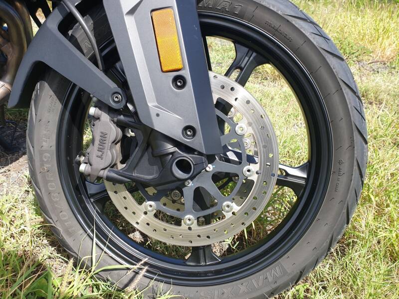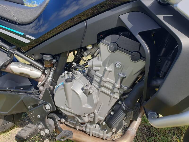 Cette CFMOTO MT800 s'équipe de l'ancien bloc KTM, le LC8c de 799cm3. Entre les mains de CFMOTO, ce bicylindre se met aux normes Euro5. Il perd donc quelques chevaux dans l’opération, en passant de 105 à 95ch, et le couple perd 9nm (77nm au lieu de 86nm). Peu importe, il a encore de beaux restes, et ne manque pas de coffre face à la concurrence. Ce cœur de KTM, prend place, dans un cadre en tube d’acier. L’amortissement est assuré par Kayaba et le freinage, par J..Juan, mais nous vous invitons à inspecter la fiche technique avant nos impressions à l’essai.