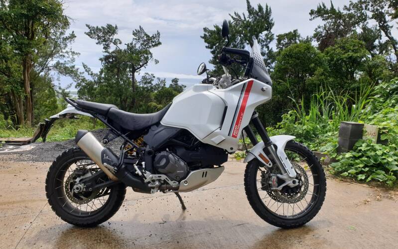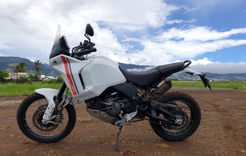 Depuis la sortie de la Yamaha Ténéré 700, en 2019, tous les constructeurs semblent avoir un regain d’intérêts pour la catégorie des trails Off-Road. Honda, Suzuki, Triumph, KTM bien sûr, mais également Aprilia, disposent à présent, d’un modèle Off-Road Mid-Size, dans leur gamme. C’est au tour de Ducati de sortir les griffes, avec la sortie de cette Desert X, à la fin de l’année 2022. On le sait, ce modèle est disponible à la Réunion depuis un petit moment, mais on a pris notre temps, avant de vous présenter un article complet. Cette Desert X est un modèle à part dans la catégorie, aussi bien au niveau de l’architecture moteur que des technologies embarquées. On pouvait s’y attendre, quand Ducati décide de concevoir une nouvelle moto, elle pousse les curseurs un peu plus loin que la concurrence.
