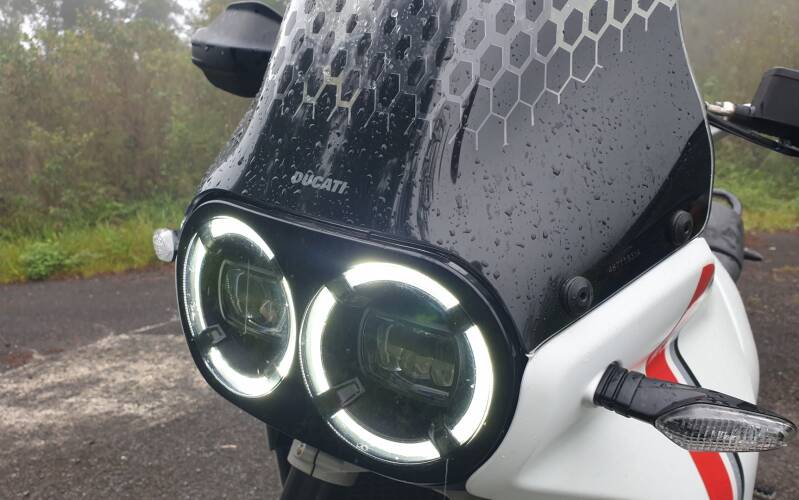 Malgré son gabarit assez impressionnant pour un trail Off-Road, la prise en main de la Desert X est facile, et l’ergonomie, plutôt simple, pour mon petit cerveau. Je suis bien installé, l’assiette de la moto est excellente, et les jambes ne sont pas trop écartées. Le bac à essence m’empêche néanmoins, de m’avancer un peu plus, et je me trouve trop loin du guidon. Les pneus Pirelli Scorpion Rally, sont un excellent compromis pour celui qui souhaite faire de la route, mais également s’amuser dans les chemins. Attention, si je fais confiance à toutes les aides électroniques concernant le train arrière, le feeling sur route, concernant l’avant, n’est pas parfait. On fait tout de même un minimum confiance à cette Ducati, qui est très bien équilibré, et on peut toujours revoir le réglage de la fourche. Le moteur est toujours un peu rugueux à l’usage, mais il a une sacré santé, et il faudra batailler pour le pousser dans ses retranchements sur route ouverte. Le shifter est bien là, mais la montée des rapports est assez dure. La commande d’embrayage hydraulique, est suffisamment agréable, et m’en servir me paraît plus naturel. C’est la première fois que je ressens un tel confort sur une Ducati, avec un amortissement, évidemment, relativement souple, sur ce type de trail. La selle est un peu dure, mais, cette moto avale les bosses en douceur. A faible vitesse, on est toujours perturbé par les petites vibrations de ce bicylindre, sous 3000tr/mn, mais c’est le prix à payer, avec de beaux et gros pistons. La Desert X sera un allié de choix pour la vie de tous les jours, malgré son bloc moteur qui vous chauffera rapidement les cuisses en ville. Si vous souhaitez l’exploiter en tout-terrain, opter pour les grands espaces, car sur une piste type enduro, le poids vous rappellera rapidement à l’ordre. N’oublions pas que le manipuler à l’arrêt, demande un certain effort. Lors de notre périple sur route humide, en descente, et afin de ne pas mettre en contrainte le pneu avant, j’ai sûrement abusé un peu trop du frein arrière, et ça s’est terminé par une petite surchauffe.