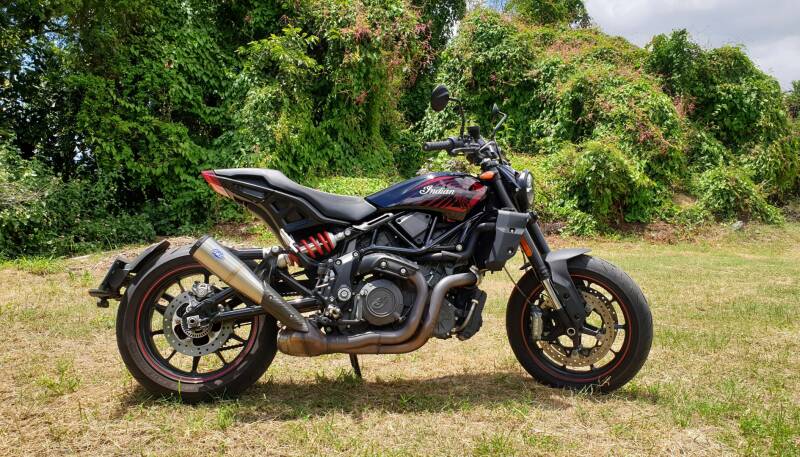 Née en 1901, la marque Indian a été en guerre ouverte contre son concurrent Harley-Davidson, pendant plusieurs décennies. Contrairement à Harley, Indian n’a jamais pu se remettre financièrement de la crise économique de 1929, et le constructeur américain fermera ses portes en 1953. Petite renaissance en 1999, Indian connaît un nouvel essor depuis 2011, et son rachat par le groupe Polaris Industrie. Réputée pour la conception de custom, avec sa Scout ou sa Chief, Indian a décidé en 2019, de proposer le premier roadster de son histoire, la FTR 1200. Cette démarche est finalement logique pour Indian, le constructeur ayant toujours été impliqué dans les courses de Flat-Track, compétition motocycliste hautement populaire sur le continent américain. La première phase (finition Rally actuelle) de ce modèle était finalement typée Scrambler, avec des débattements de suspensions généreux, une garde au sol confortable, et une monte pneumatique mixte assez particulière, avec des jantes de 19 pouces à l’avant et 18 pouces à l’arrière. Ce modèle avait toutes les armes en main pour venir chatouiller les gammes Scrambler de Triumph, BMW ou Ducati. Finalement, afin de rendre sa FTR un poil plus sportive, Indian a décidé de proposer une version purement roadster en 2021. C’est cette dernière qui va nous intéresser aujourd’hui.