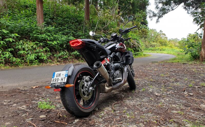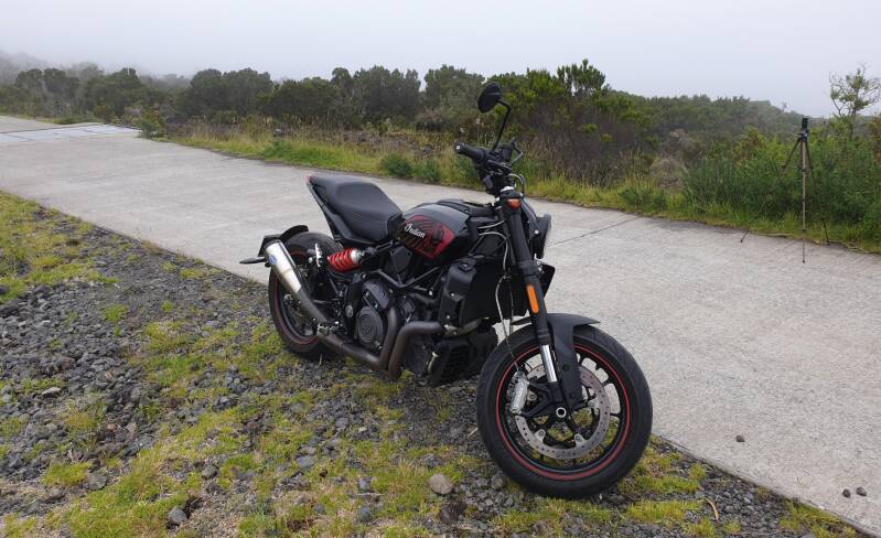 Equilibre naturel pour ce gros roadster, qui bénéficie d’une répartition des masses idéale entre l’avant et l’arrière. Le bac à essence placé sous la selle, et la batterie positionnée devant le moteur en partie basse, y participent. La position de conduite est neutre, contrairement à la plupart des concurrentes. C’est automatiquement plus confortable avec les bras qui sont moins sollicités. Cette particularité a l’avantage de simplifier les manoeuvres, et de rendre cette moto plus facile à piloter. Dommage, sur chemins sinueux, on doit composer avec un empattement conséquent. Ca apporte un surplus de stabilité, mais réduit quelque peu la maniabilité de l’engin. Le grip est assez impressionnant et on oublie assez vite les 230kg de cette FTR. En montant les rampes du Maïdo, j’ai jugé l’amortissement beaucoup trop ferme, plus adapté à la route nationale. Heureusement, cette dernière est réglable, mais on peut être sûr que cette moto gardera de toute façon, une certaine rigidité. Le moteur est la pièce de choix de cette américaine. La crête de couple est atteinte à 6000tr/mn, mais il sera inutile d’atteindre ce type de régime, le moteur étant disponible dès 1800tr/mn. La plage de régime est extrêmement large, avec une puissance maxi atteint à plus de 8000tr/mn. Pas la peine d’atteindre de telles limites, et il est préférable d’enchaîner les rapports le plus rapidement possible, afin d’avoir un pilotage le plus coulé possible. Le freinage avant est parfait, avec une progressivité et un mordant très appréciable.