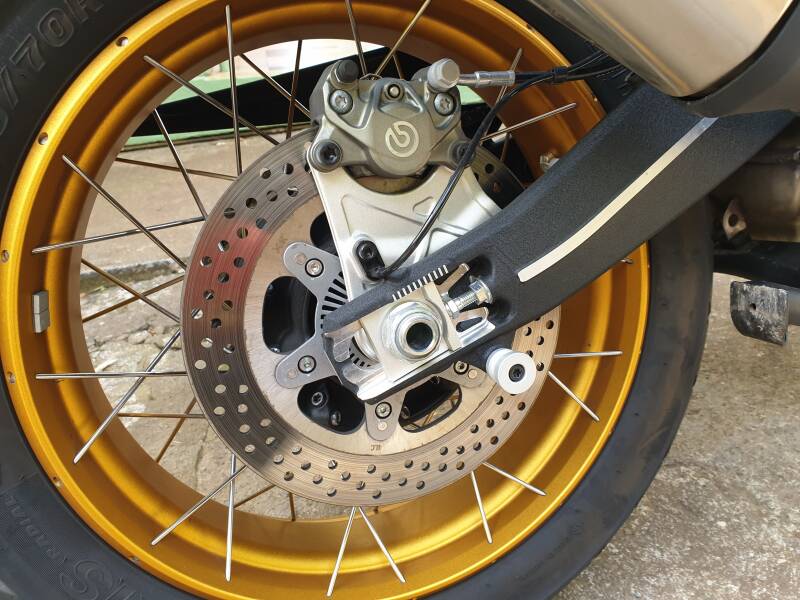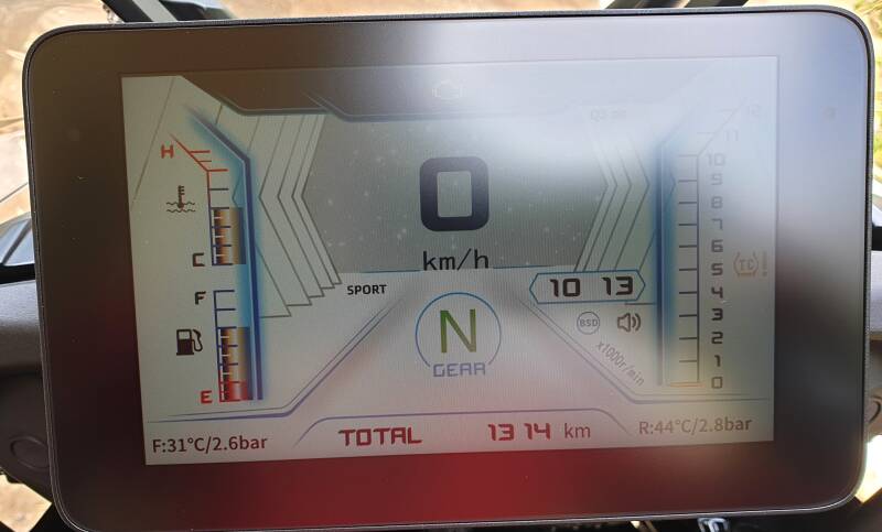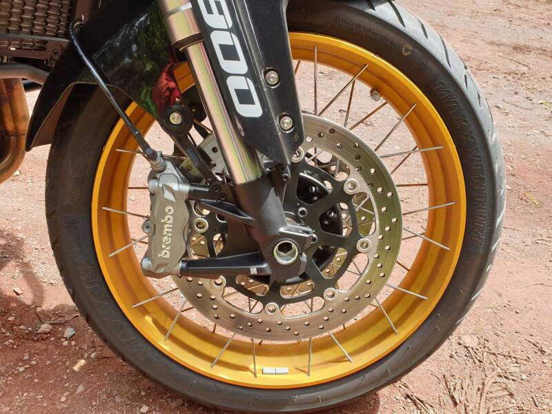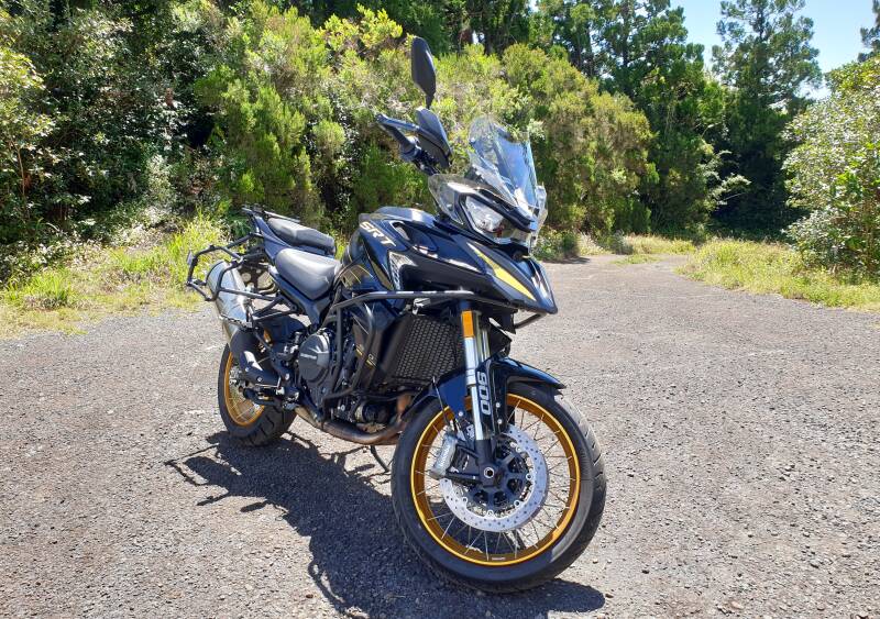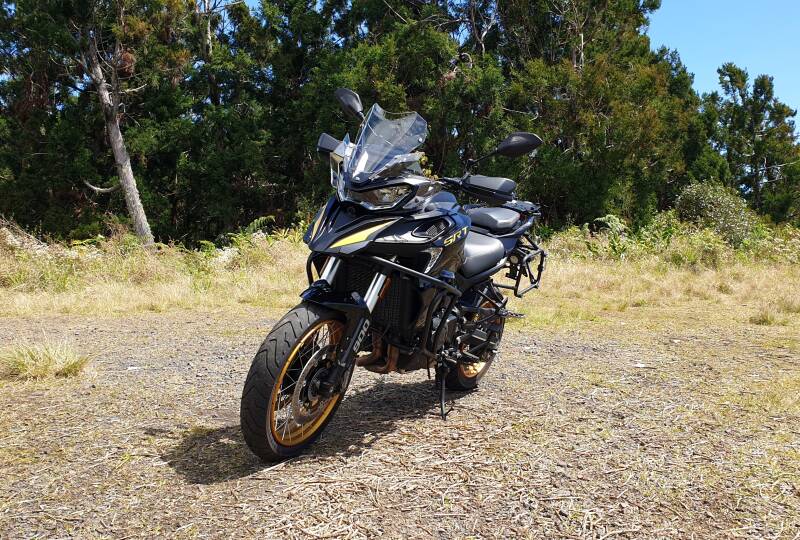 Pas de défauts, concernant la qualité de fabrication, les Chinois ayant compris depuis un moment, l’importance d’une bonne présentation générale. Ce trail Midsize est très polyvalent, en s’équipant d’une jante de 19 pouces à l’avant, et de 17 pouces à l’arrière. Il cache un châssis treillis tubulaire en acier, repose sur des suspensions Marzocchi réglables, se dote d’un système de freinage Brembo, et dispose évidemment de certaines aides à la conduite, comme le contrôle de traction, le régulateur de vitesse, l’alerte d’angle-mort, ou le Shifter Up and Down. Mais on va aussi pouvoir découvrir son bloc bicylindre en ligne de 904cm3, développant la respectable puissance de 95ch, et un couple généreux de 90nm.