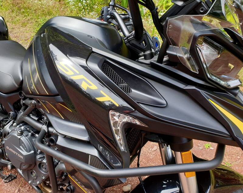 Le groupe Geely possède également la marque de moto italienne, Benelli. Il existe donc logiquement, un partenariat technique entre QJMOTORS et Benelli. On ne s’attendait néanmoins pas à autant de similitudes, au niveau du style. La SRT 900 SX s’inspire de quelques références actuelles, comme la Triumph Tiger 900 ou la Ducati Multistrada V2, mais ressemble particulièrement, à la Benelli TRK 702. La face avant avec ce bec de canard, le double optique, les prises d’air, les écopes, cette QJMOTORS dispose d’un look agressif. J’aurai apprécié une identité propre de la part de ce trail, mais il faut avouer que son style, reste tout de même, très sympa. Avec son look d’aventurier, ce gros bébé inspire confiance, mais cette moto est ultra-pratique, et peut se transformer en véritable voyageuse. Il vous suffira pour cela, d’installer les trois grosses valises, livrées de série.