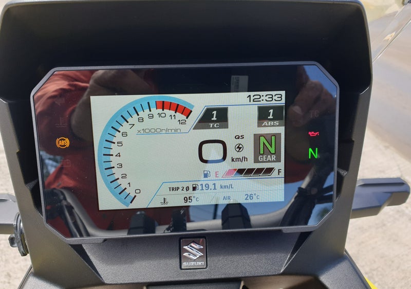 Les nouveautés ne s’arrêtent pas là, puisque Suzuki a enfin décidé de lancer un tout nouveau bloc moteur. Elle s’appelle toujours V-Strom, mais contrairement à sa petite soeur 650, la 800DE abandonne l’architecture en V, et imite les concurrentes, avec un bicylindre parallèle. Ce type de moteur est plus compact, mais surtout, moins cher à produire. La marque nippone a tenu néanmoins à lui donner du caractère, tout en réduisant les vibrations au maximum, grâce à un calage à 270° et un double arbre d’équilibrage. Cette nouvelle mécanique sera associée à de nombreuses béquilles électroniques. Vous pouvez paramétrer ces différentes aides, grâce à un joli petit écran TFT couleur de 5 pouces.