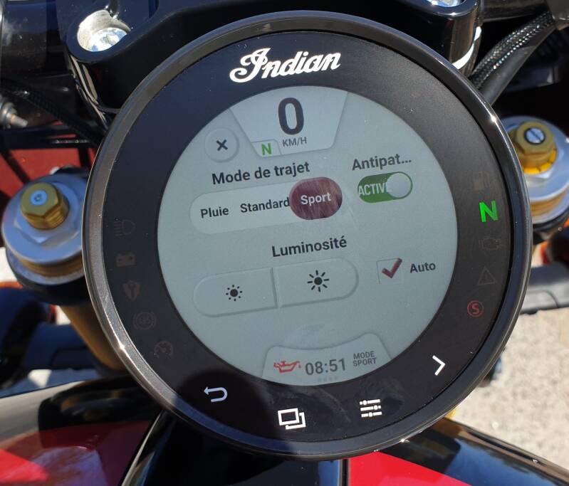Si vous êtes blasé par le manque de caractère de certaines motos actuelles, pourtant très efficaces, ne déprimez plus, il y a une solution à vos problèmes. Cette nouvelle Indian Scout est un excellent début de réponse. Compliqué de ne pas craquer pour ce look de custom sportif, et vous serez totalement sous le charme, une fois le moteur en marche. La concession locale a eu la bonne idée de l’équiper d’une ligne S&S, qui vous donnera encore plus de frissons à l’accélération et quand on décompresse. On est définitivement dans l’ambiance, et la partie-cycle de cette « 101 » seconde parfaitement ce gros moulin. Le train avant est un peu paresseux dans les serré, mais la stabilité et le grip, vous surprendront dans les enchaînements rapides. A tout cela, Indian ajoute une bonne dose de technologies, avec un petit écran tactile un peu lent à l’allumage, mais très ergonomique à manipuler. Bref, la gamme Scout est très large, avec un accastillage différent selon la version choisie. Vous trouverez à coup sûr, votre bonheur.